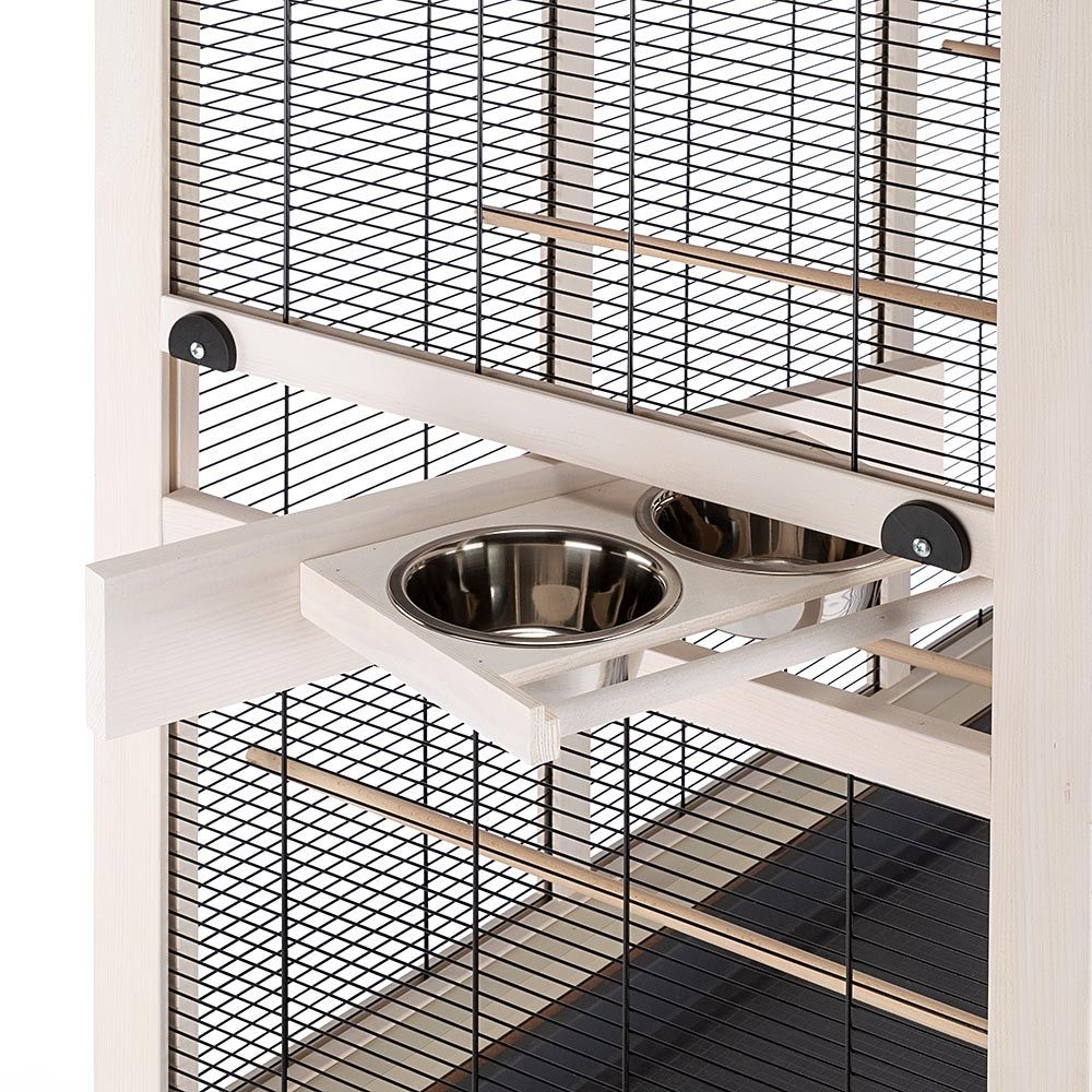 Wilma Large è un'elegante voliera per uccelli in un robusto legno di pino nordico di alta qualità certificato FSC, ovvero proveniente da foreste gestite in maniera ecosostenibile. La voliera è studiata nei dettagli, con finiture di colore chiaro e tetto leggermente spiovente. Wilma Large è un ampio habitat pensato per durare nel tempo, il legno, infatti, è trattato con una vernice ecologica, atossica e antimuffa, resistente ai raggi U.V. e repellente all'acqua. Inoltre, la rete di metallo verniciato la rende resistente alla corrosione. Sul lato frontale vi è un ampio sportello apribile con gancio di sicurezza. Sui lati sono presenti due sportellini utili per le operazioni di manutenzione. Il fondo della voliera è dotato di un capiente cassetto estraibile in plastica per contenere sporco e residui di cibo. L'habitat è completo di tutti gli accessori: posatoi e mangiatoie in acciaio, estremamente pratiche perché montate su un base portaciotole in legno girevole che consente di riempirle di cibo dall'esterno in modo veloce. Le ciotole sono inoltre estraibili per le operazioni di pulizia,