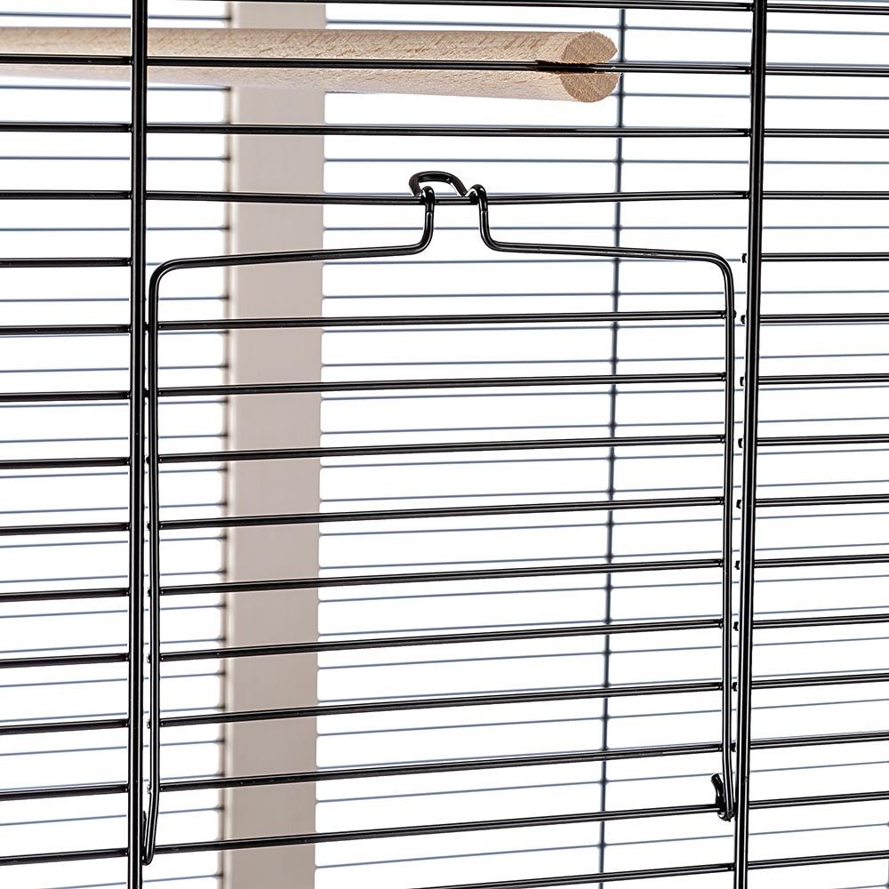 - Accessori inclusi: 7 posatoi e 2 mangiatoie in acciaio da 0,5 litri cadauna, removibili dalla base girevole portaciotole in legno, e riempibili comodamente dall'esterno.