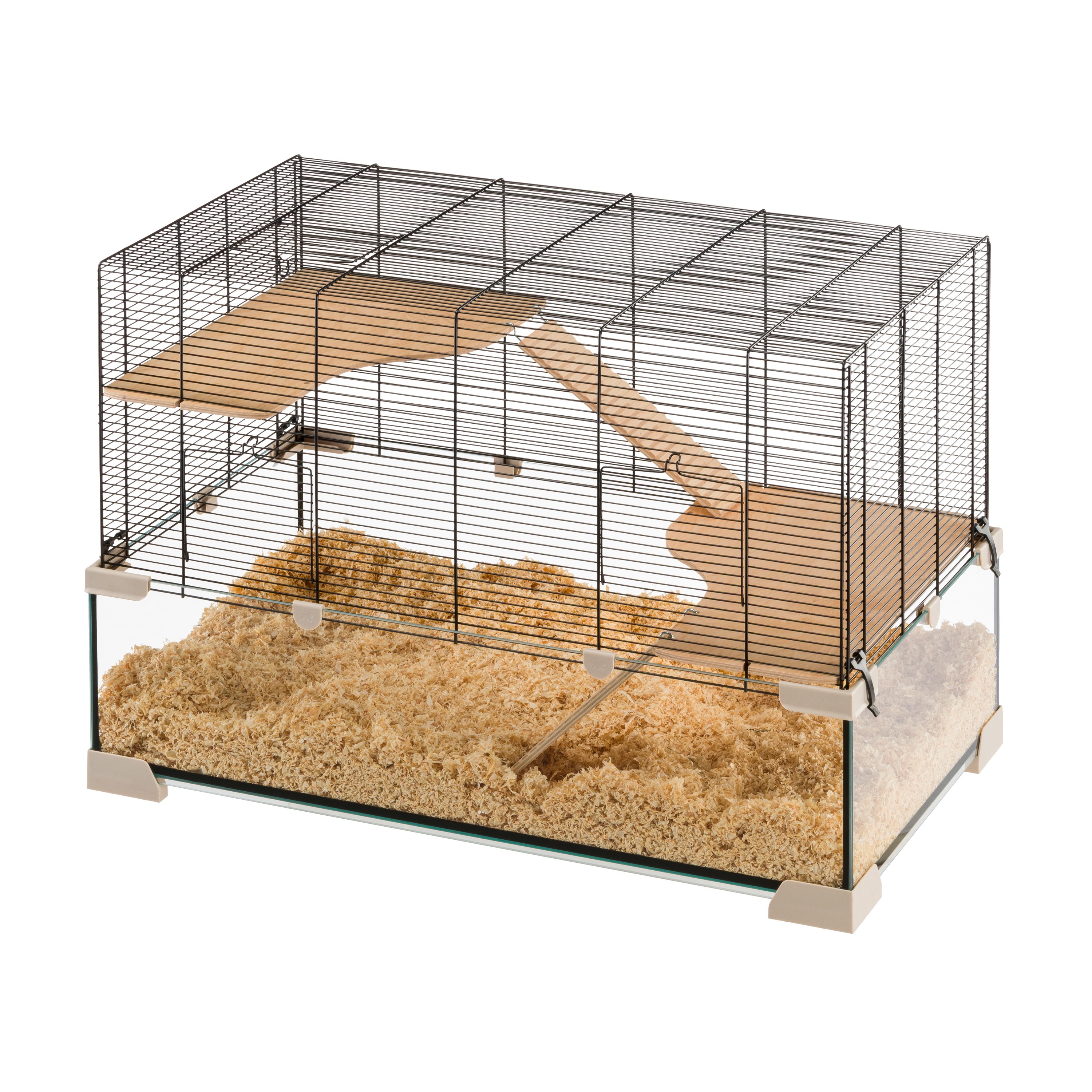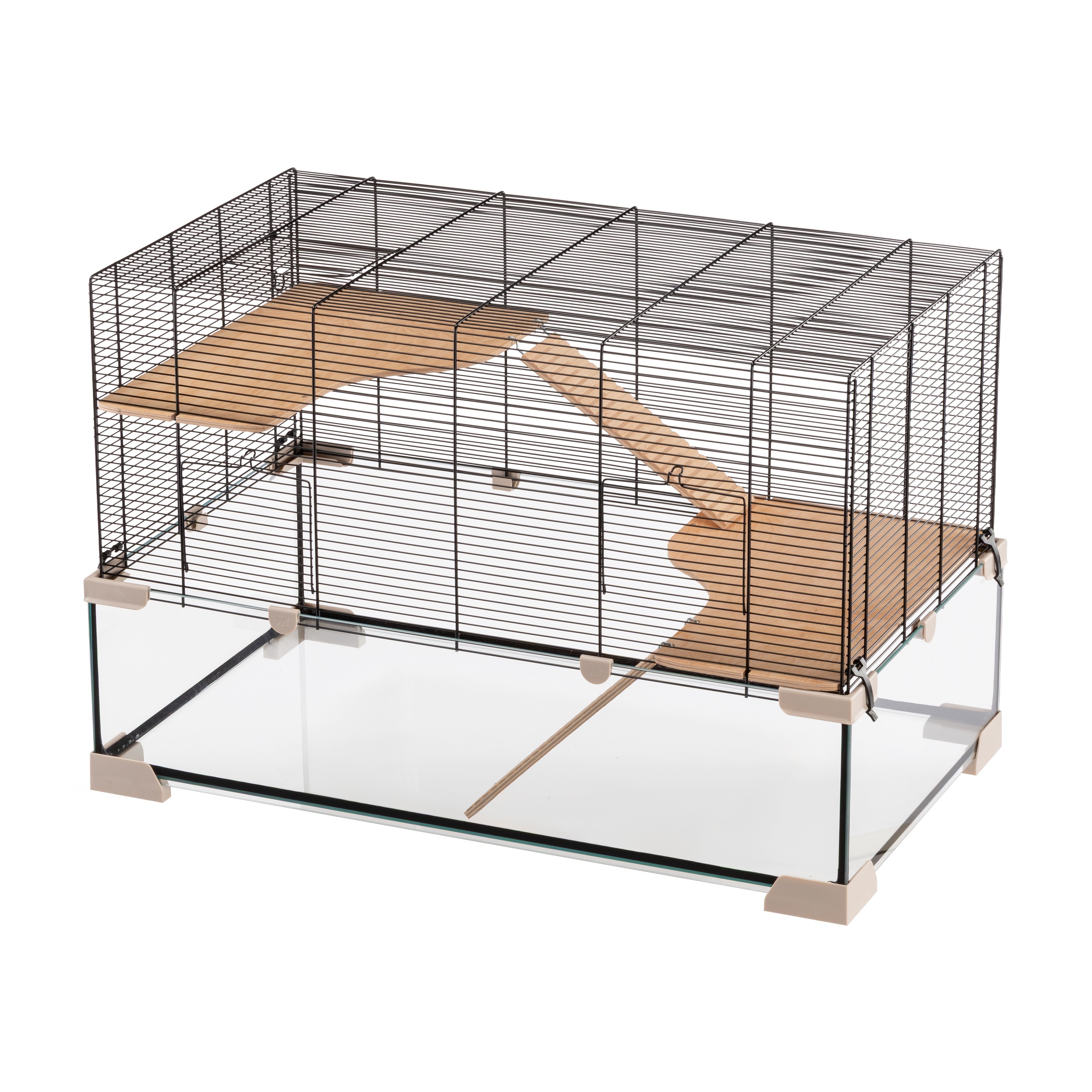 - Gabbia per roditori con base profonda in vetro, che permette alll'animale di scavare e impedisce fuoriuscite di lettiera. Completa di piedini d'appoggio in plastica.